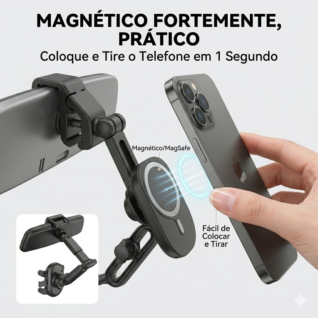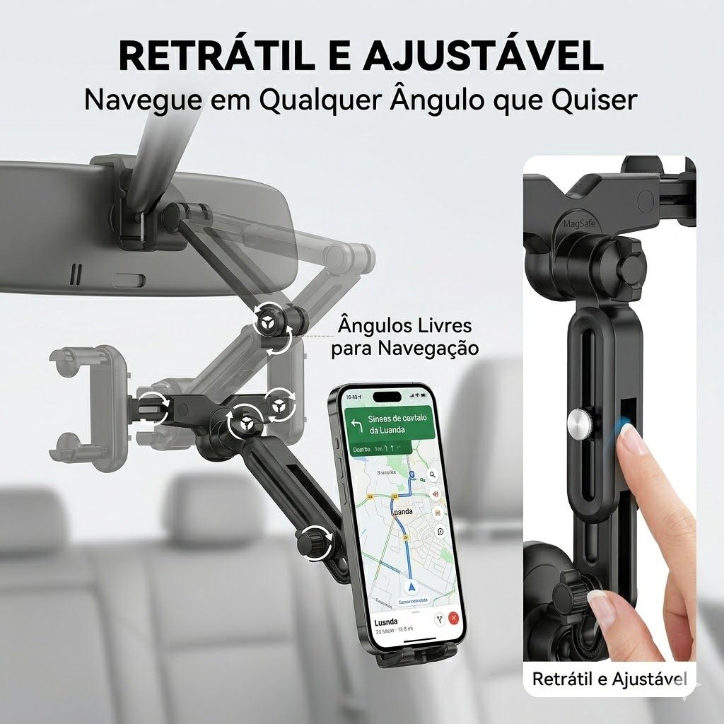 Suporte Magnético para Celular Retrovisor de Carro Telescópico 360° Giratório, Universal para iPhone Samsung Xiaomi, Não Cai em Buracos, Não Bloqueia a Visão, Perfeito para Navegação em Angola