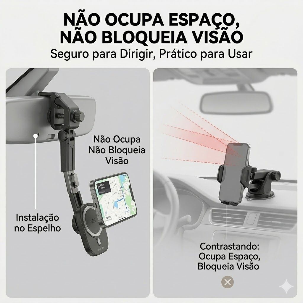- Não bloqueia a visão do retrovisor e não atrapalha o volante! Dirija seguro sem distrações!